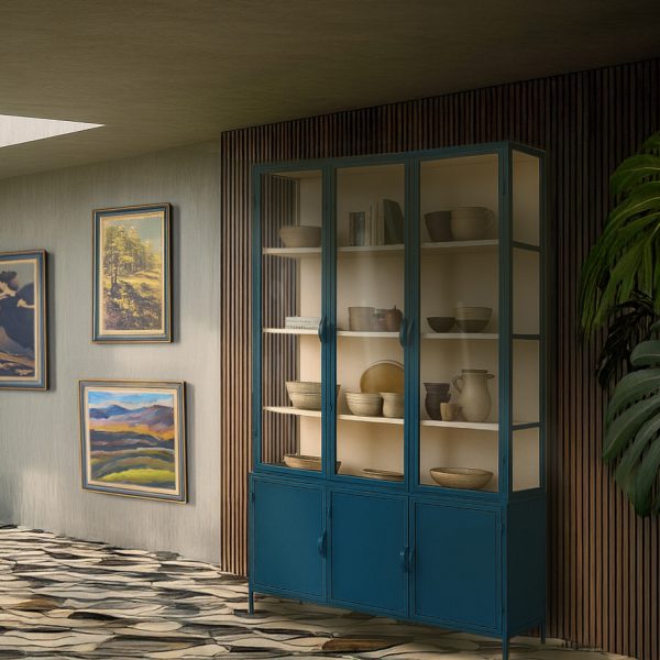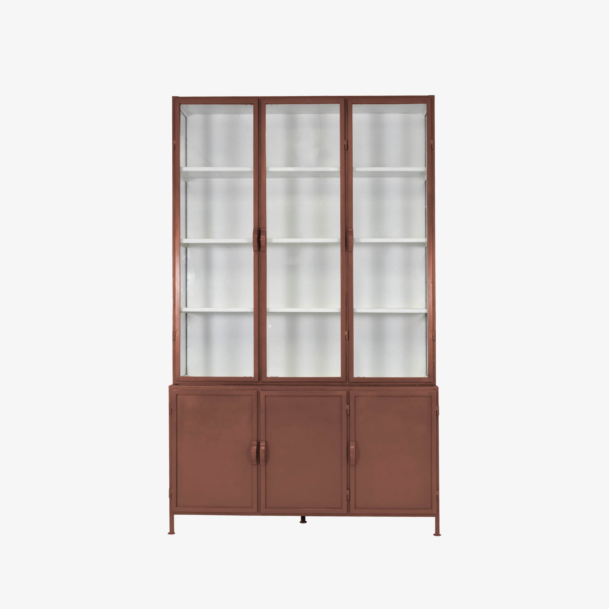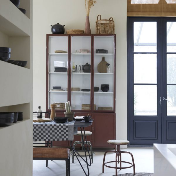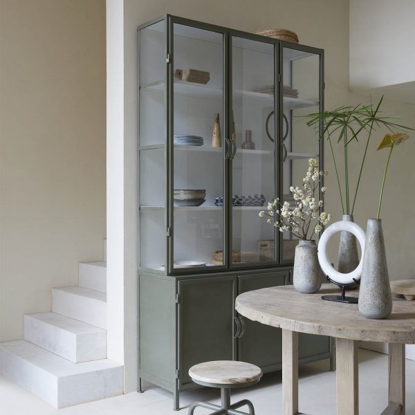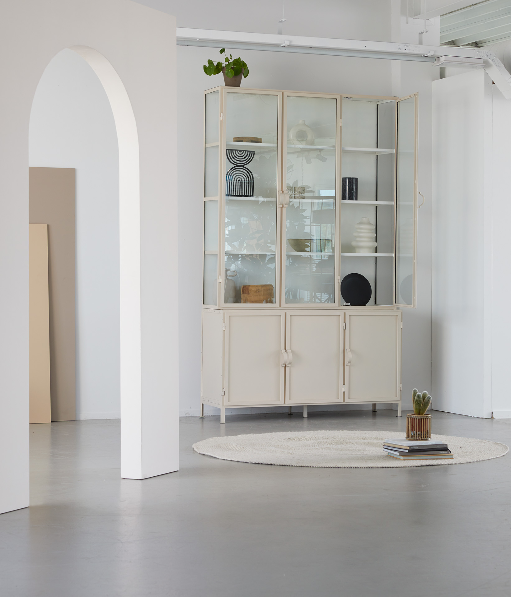 Ambachtelijk gemaakte metalen vitrinekast met 6 deuren in vintage zwart met witte binnenkant. De bovenste rij deuren zijn voorzien van helder glas met binnenin metalen planken. De vitrinekast Detroit bestaat uit 2 delen en is tevens in geheel wit, olijf groen en terra leverbaar.