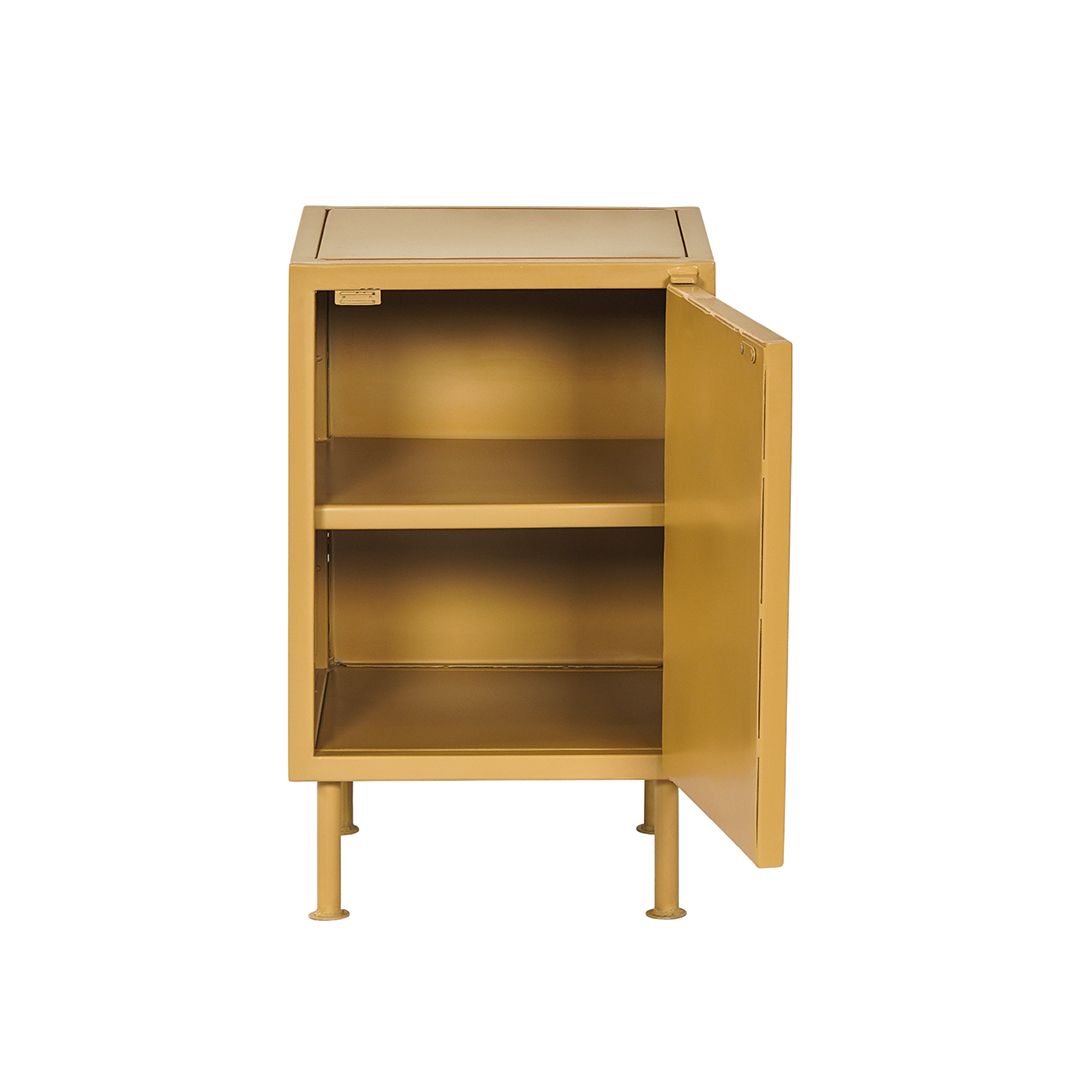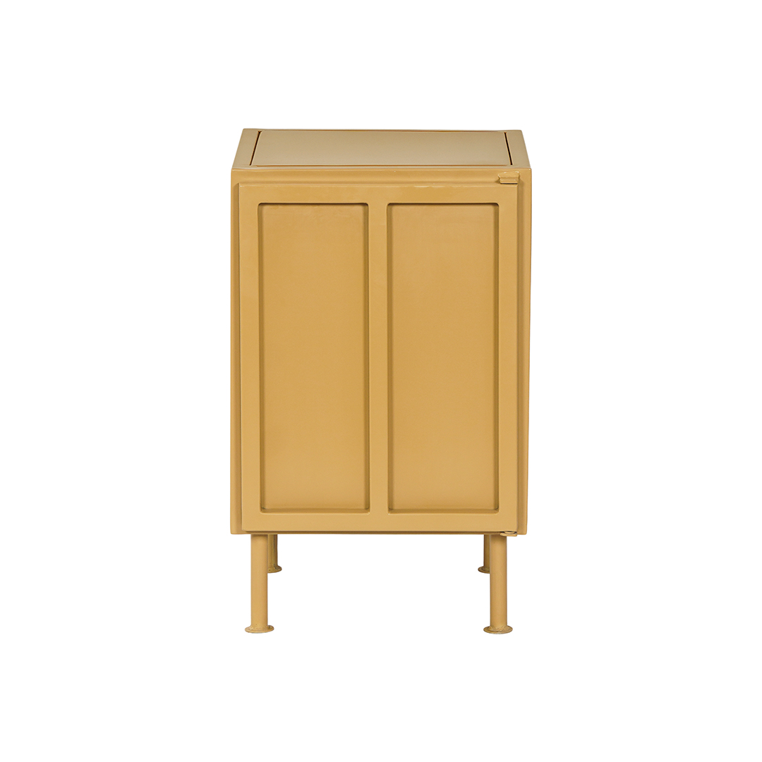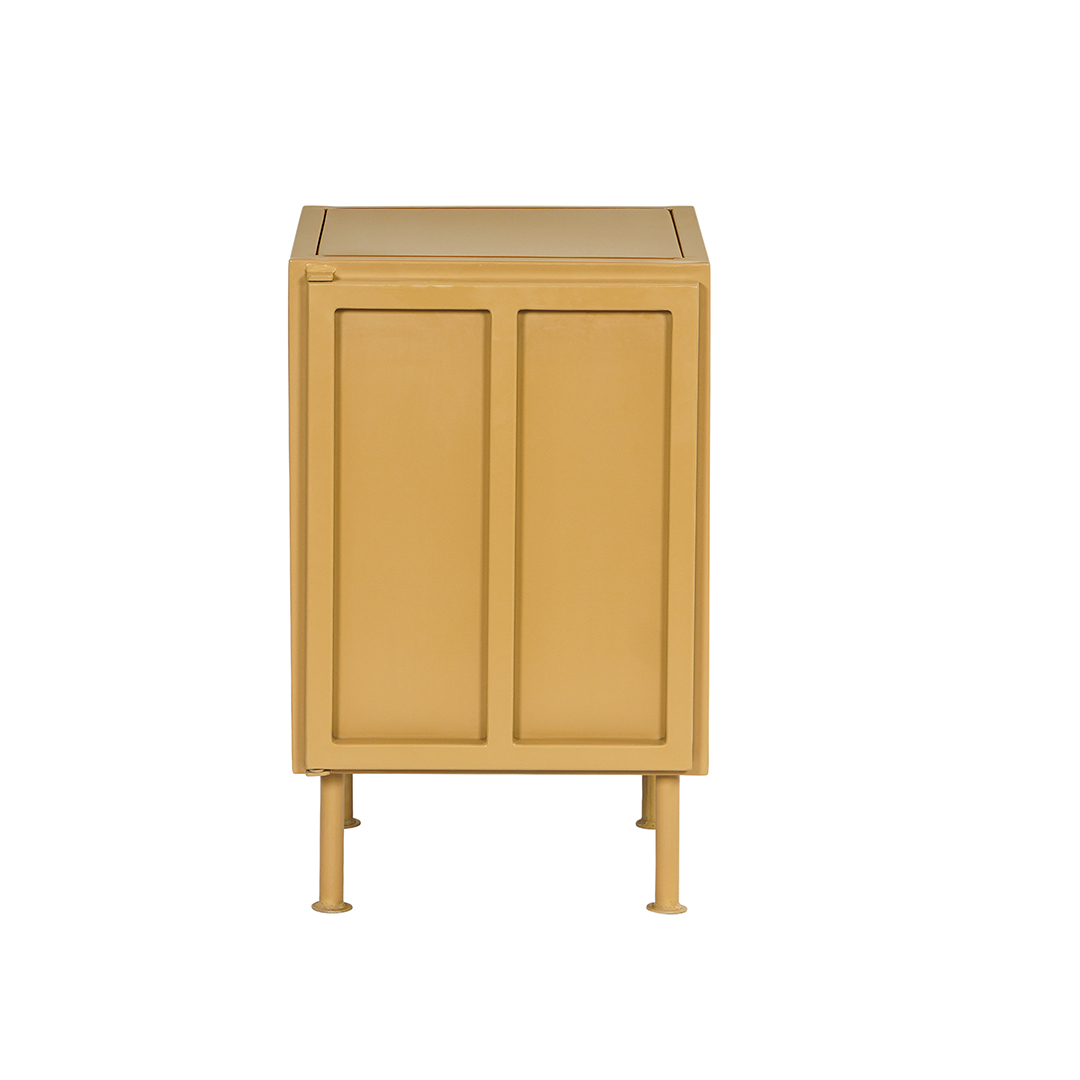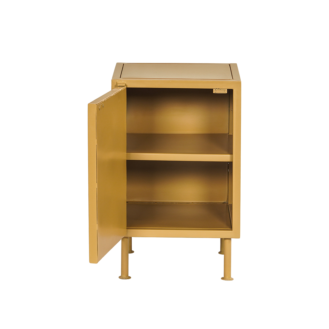 Klein retro nachtkastje van metaal in de trendy zandkleur, mosterd of olijfgroen. Achter de deur bevindt zich een metalen legplank. Het is mogelijk om het kastje met de deur rechts- of links draaiend te bestellen.