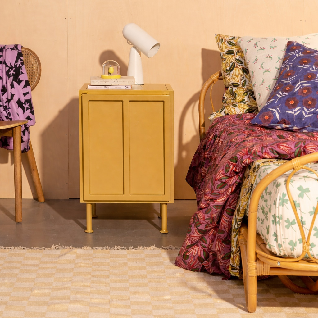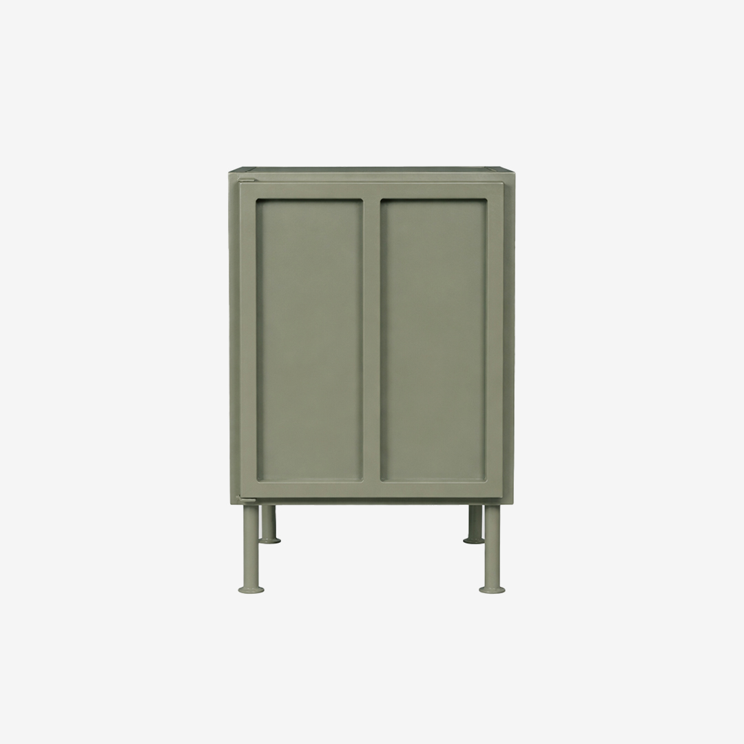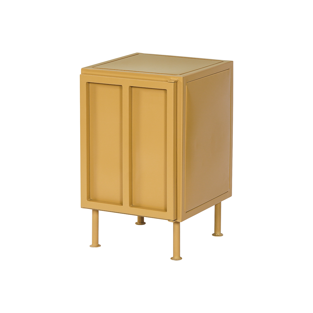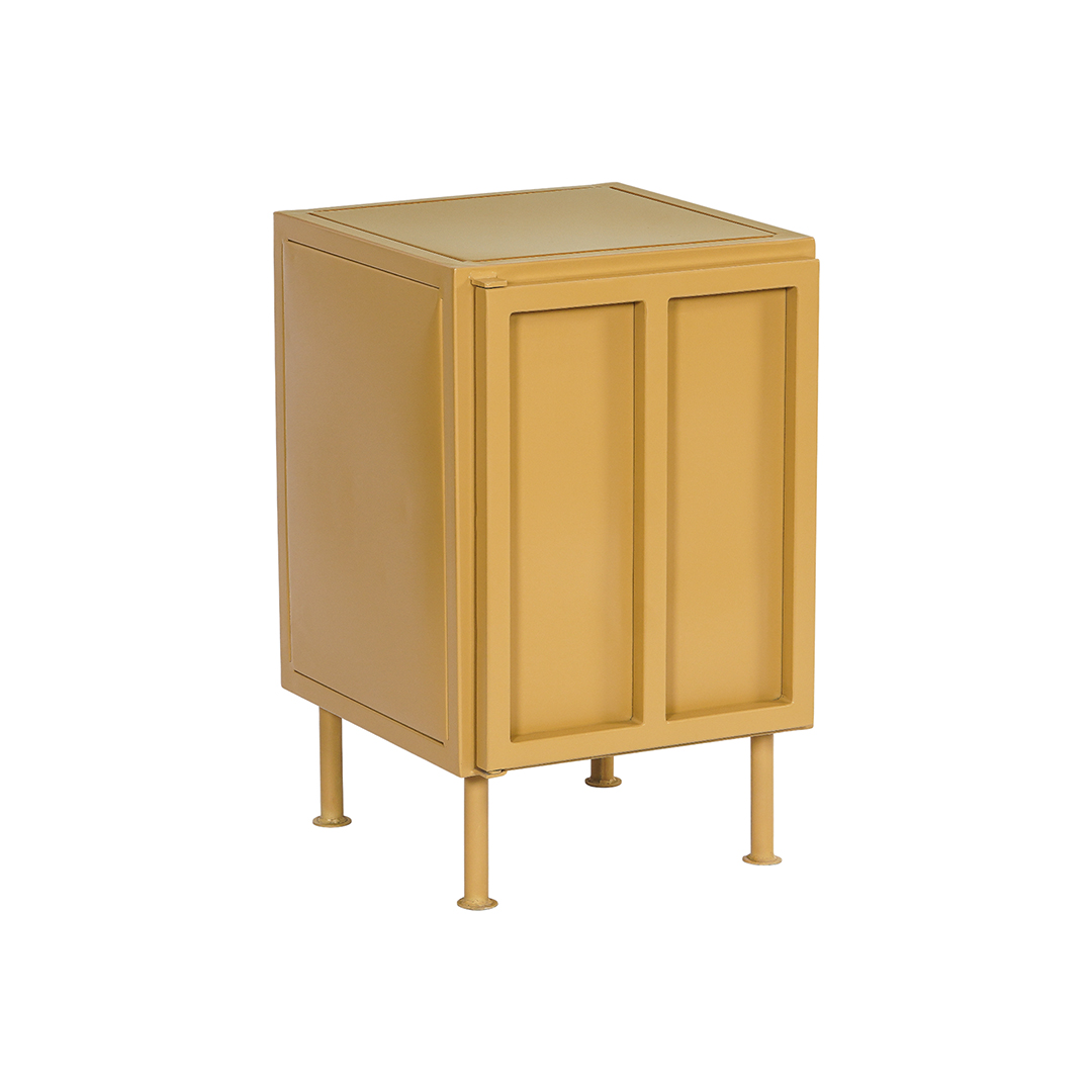 Klein retro nachtkastje van metaal in de trendy zandkleur, mosterd of olijfgroen. Achter de deur bevindt zich een metalen legplank. Het is mogelijk om het kastje met de deur rechts- of links draaiend te bestellen.
