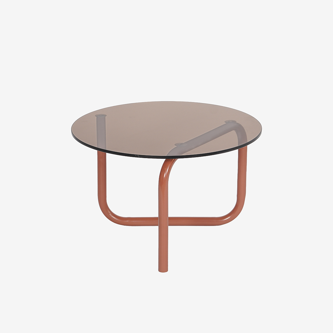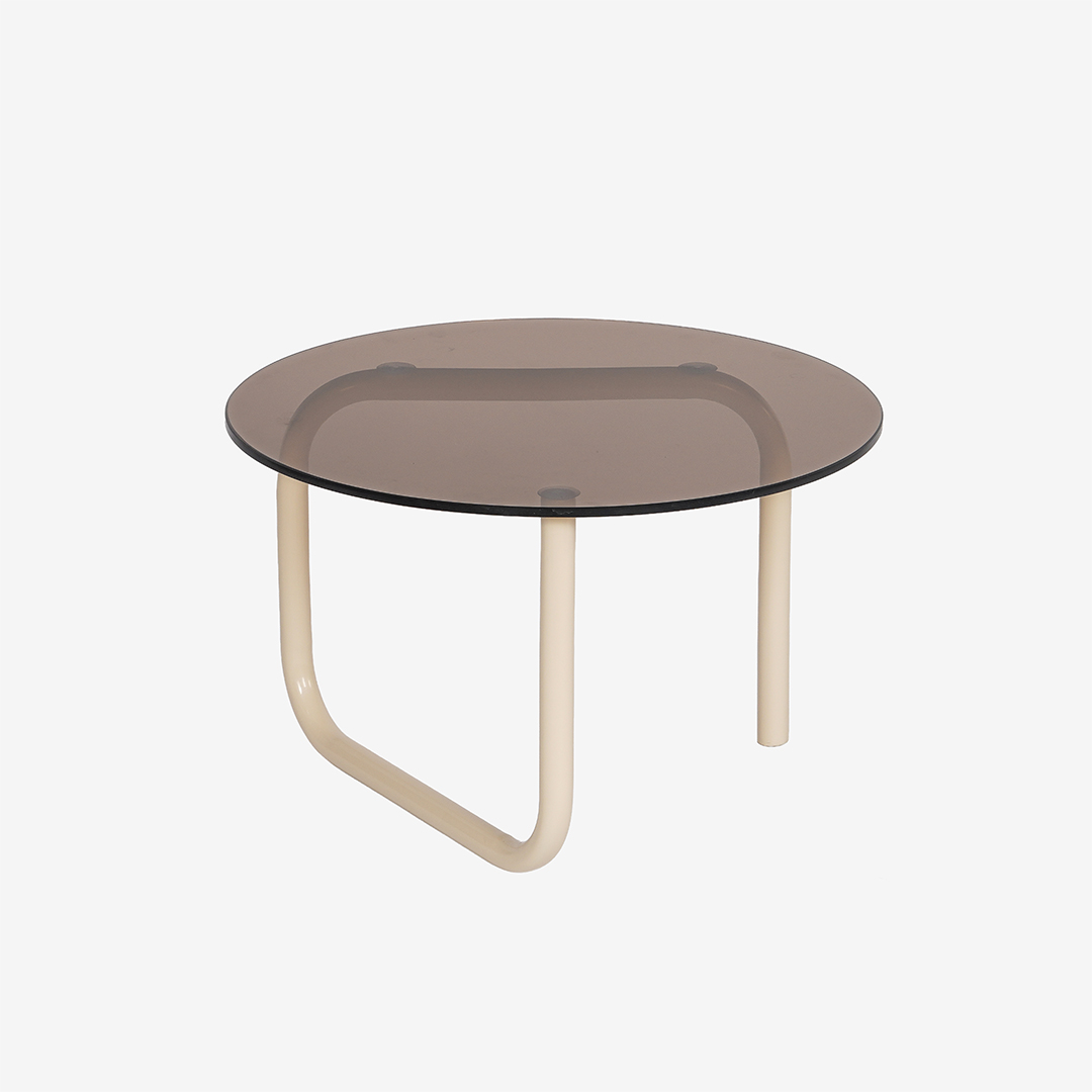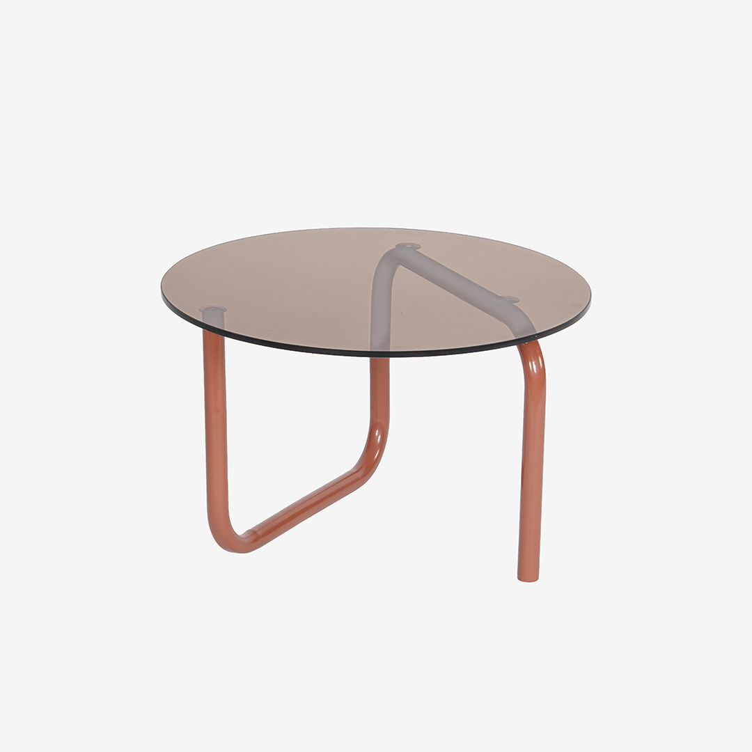 Salontafel Colby speelt met contrast en karakter. Het ronde blad van bruin gekleurd glas rust op een metalen onderstel dat zich in vloeiende, onverwachte lijnen onder het glas beweegt. Het silhouet oogt grafisch en luchtig tegelijk, waardoor het ontwerp vanuit elke hoek blijft verrassen.