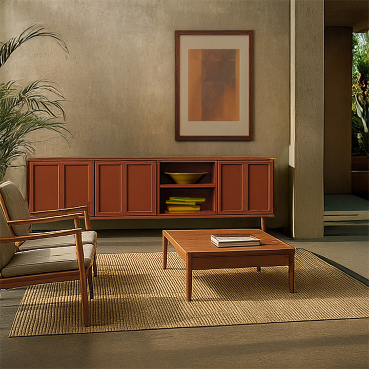 Metalen tv-dressoir met open vak en 3 deuren. Ambachtelijk gemaakt met vintage look in de kleuren zand, terra of olijfgroen.