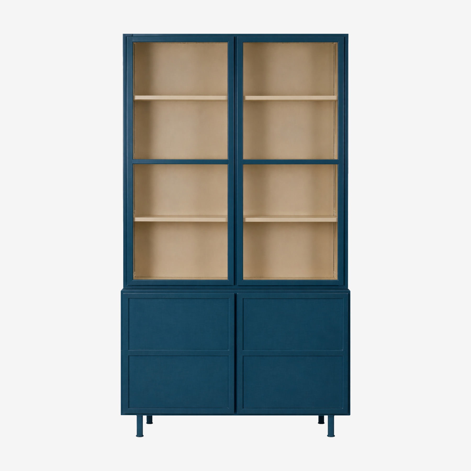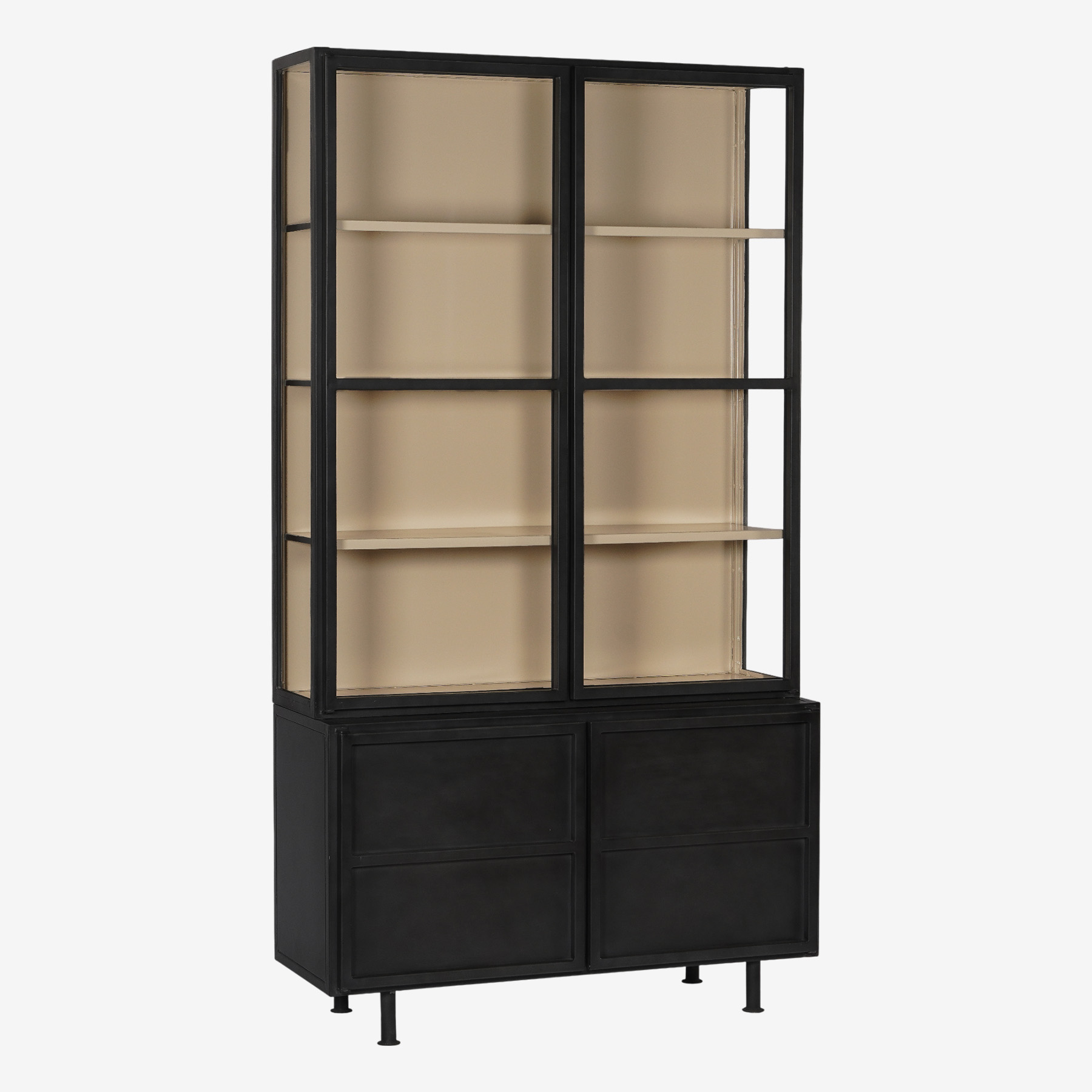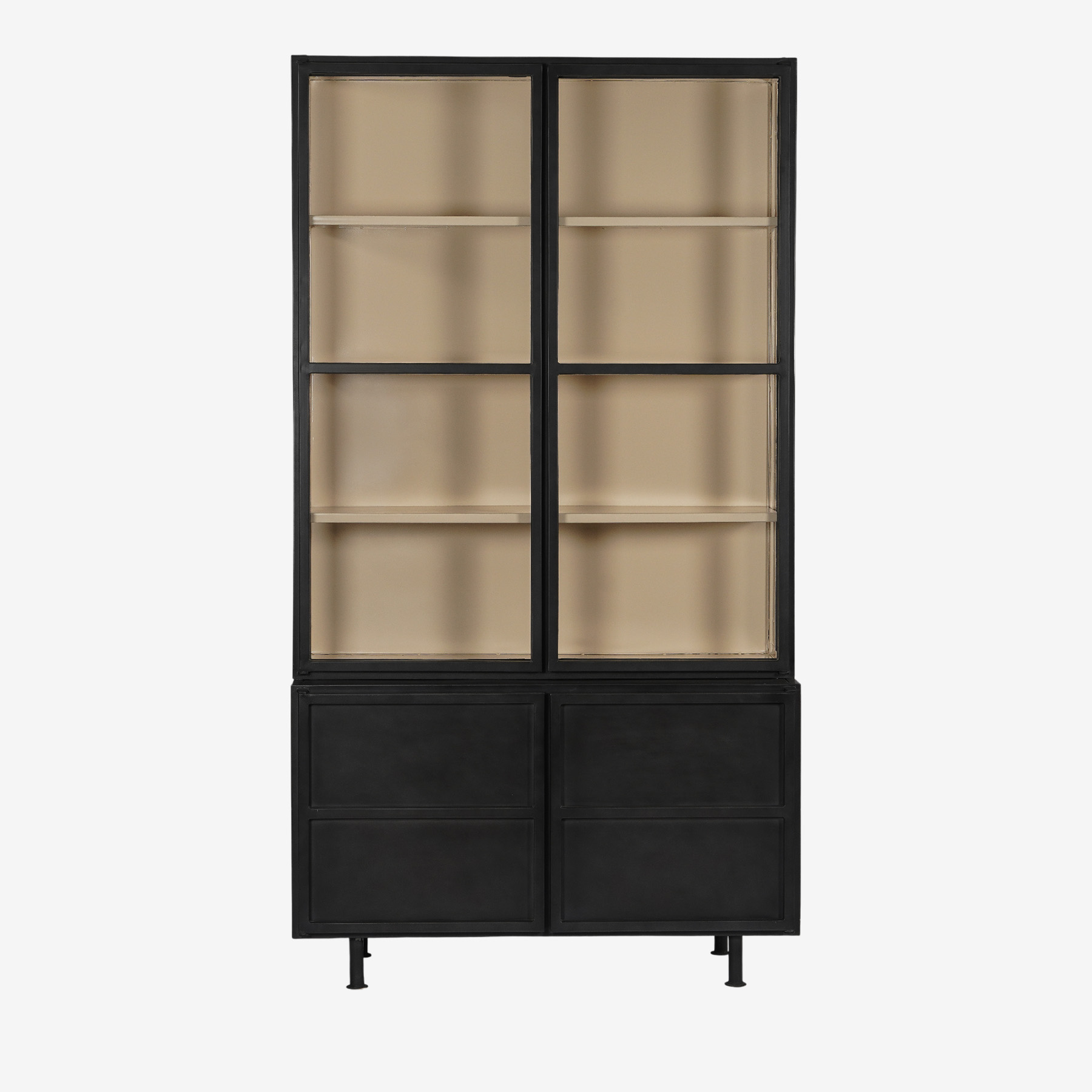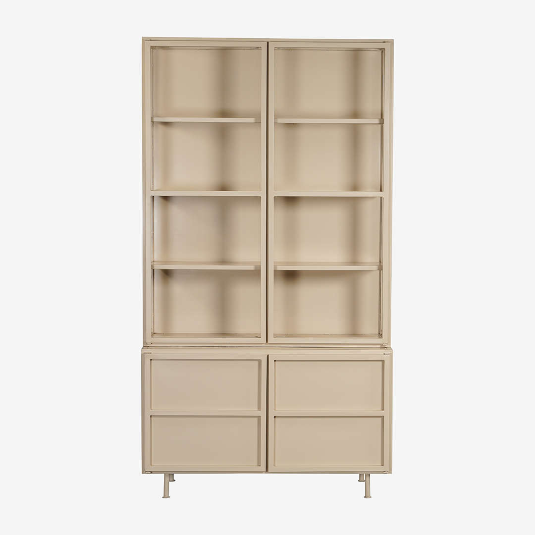 Deze metalen vitrinekast combineert openheid en opbergruimte in één stijlvol ontwerp. De bovenste twee deuren van glas laten je favoriete items mooi uitkomen, terwijl de onderste twee dichte deuren praktische opbergruimte bieden. Het subtiele lijnenspel op de fronten geeft de kast extra karakter en benadrukt de ambachtelijke afwerking. Uitgevoerd in een zachte zandkleur met een verfijnde vintage look, past dit meubel naadloos in uiteenlopende interieurs.